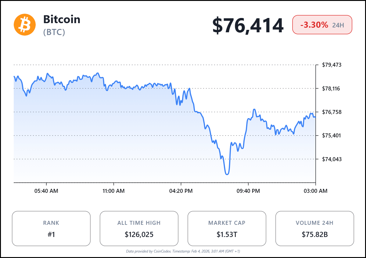 The crypto market faced a brutal reset on February 3, when Bitcoin plunged to the $72,000 zone during the European evening session. BTC is now trading around $77,000–$78,000 after briefly losing the key $75,000 support level. The intraday drop marked one of the sharpest corrections of 2026, with volatility spiking across spot and derivatives markets.