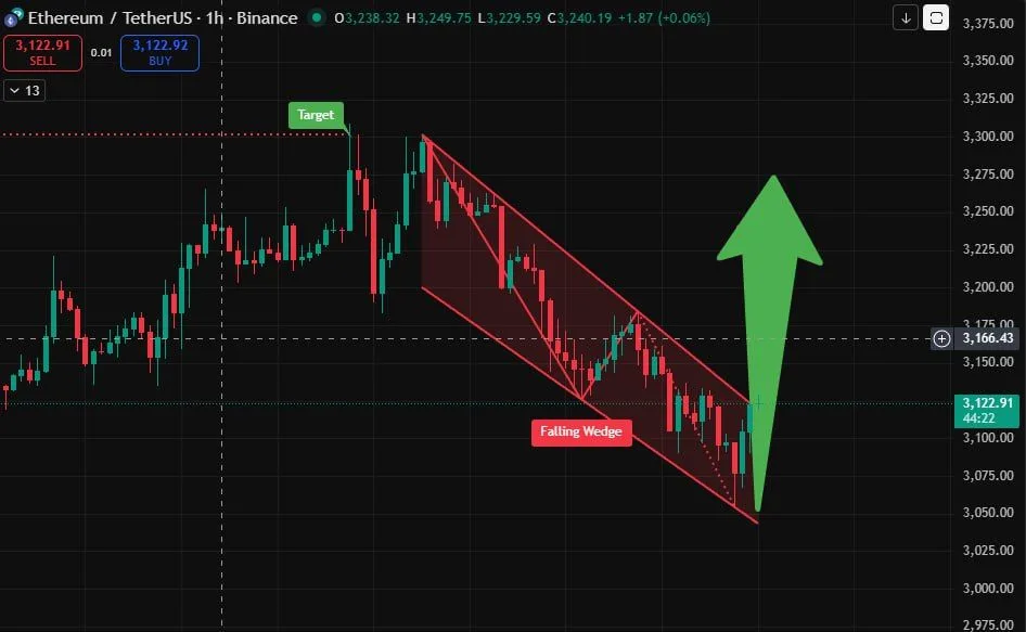 Ethereum falling wedge tightens as ETH holds near $3,123