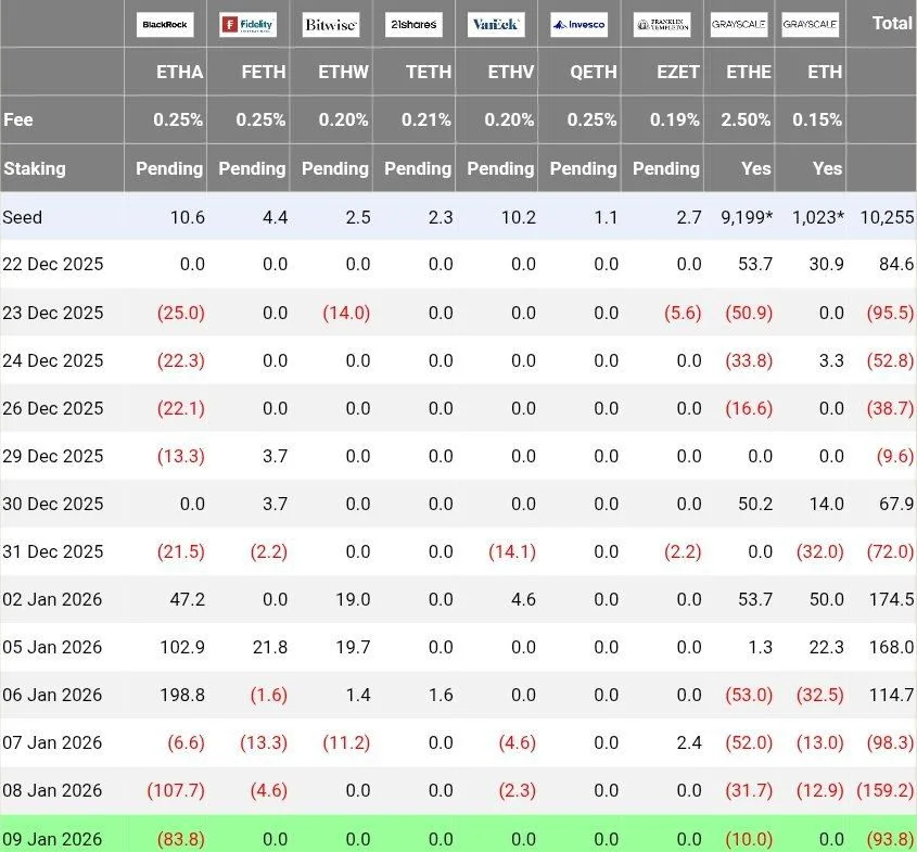 U.S. spot Ethereum ETFs posted a net outflow of about $93.8 million on Jan. 9, based on the flow table shared alongside a post from market commentator Ted Pillows.