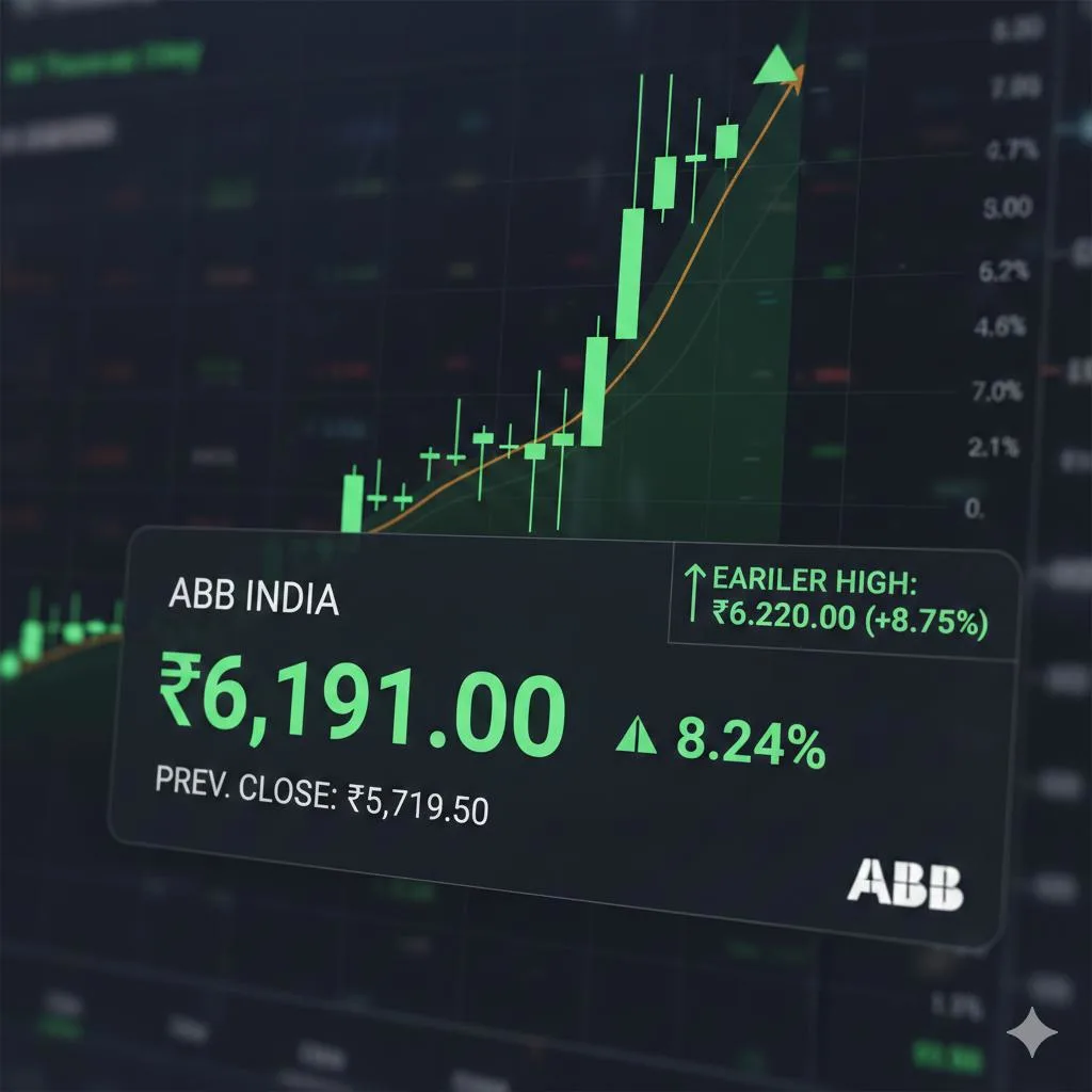 ABB India is currently trading for ₹6,191.00, up by 8.24% from the previous close of 5,719.50. The stock soared to ₹6,220.00 earlier, an increase of 8.75%.