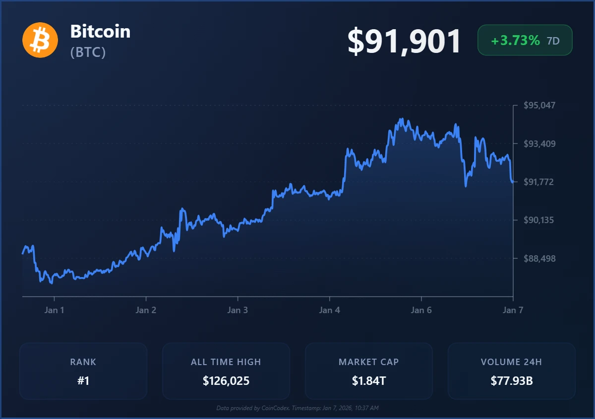 Bitcoin trades around $91,901 at the time of writing, showing weekly gains near 3.99% while maintaining a position above short-term technical support. Price action shows stability after a dip to $92,446, where buyers defended the area near the 21-day moving average around $91,800.
