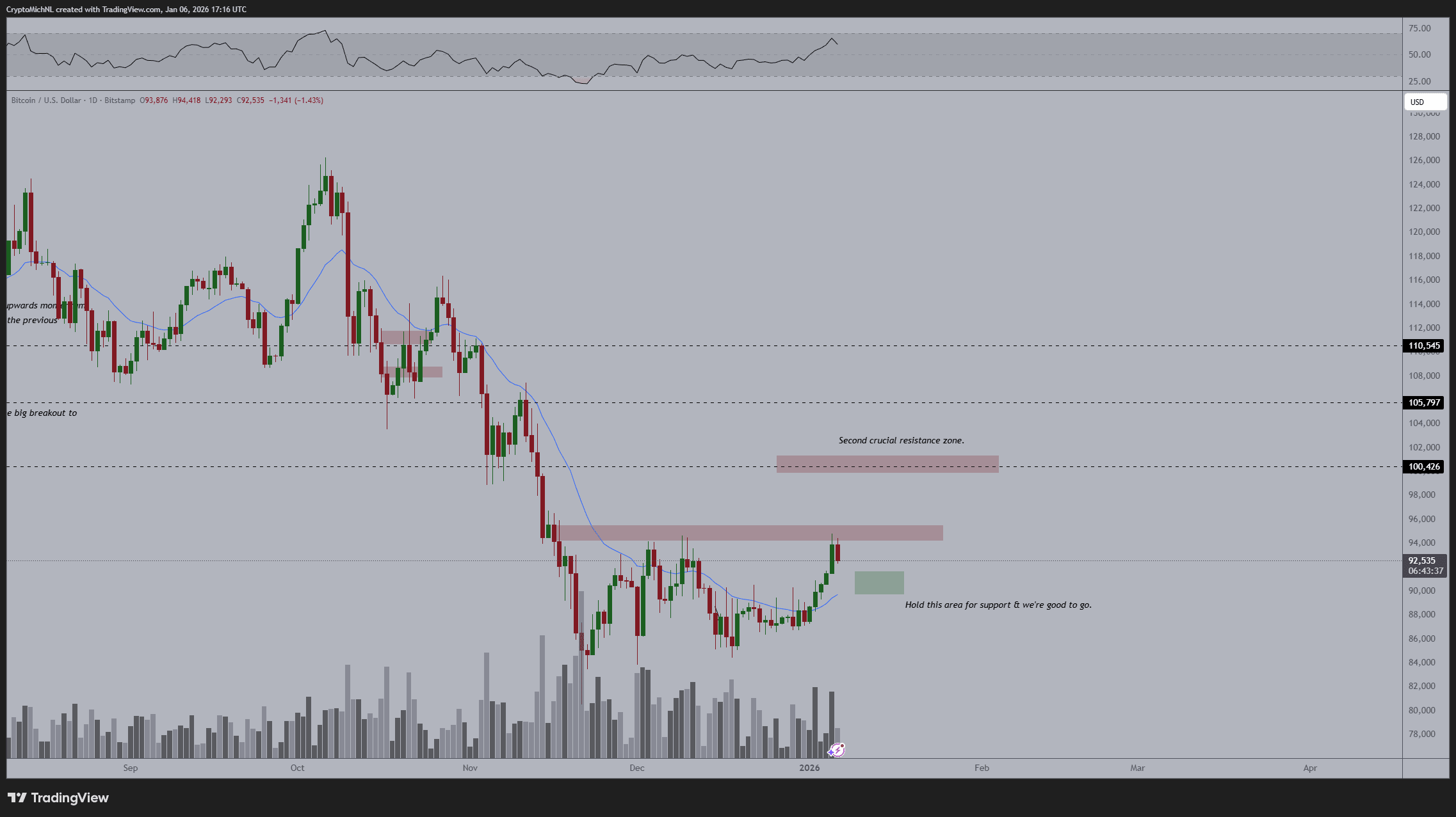 The same analysis stresses that the $93,500 area must hold as support to maintain a bullish mid-term bias.