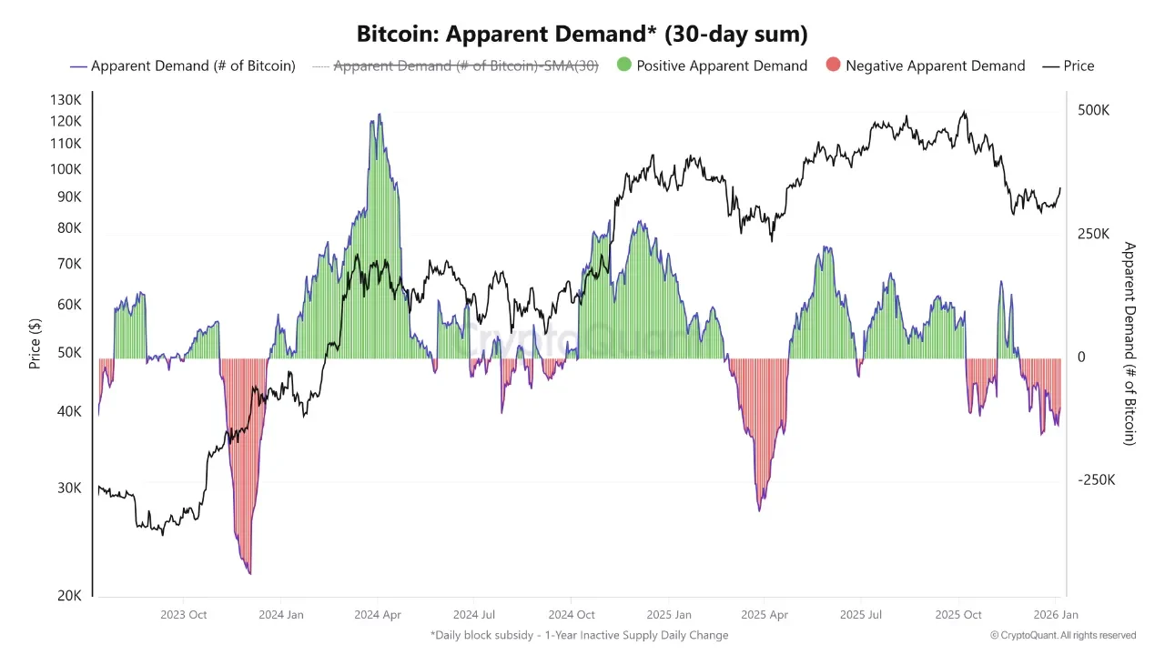 Despite price stability above $93,000, on-chain data shows weak demand. Analysts note that a stronger recovery in on-chain activity must emerge to support a sustained return toward $100,000. Trading volumes remain subdued, and sentiment across the market stays mixed. These conditions limit conviction behind upside moves.