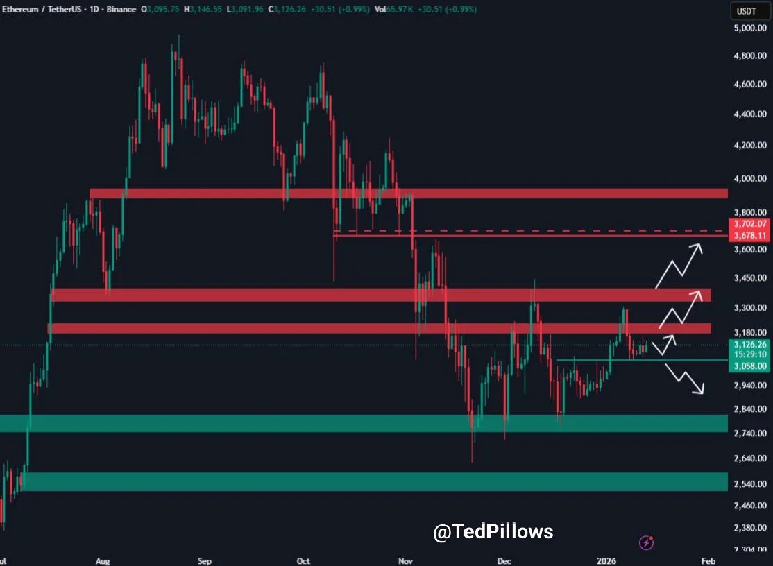 Ethereum continues to trade sideways on the ETH/USDT daily chart from Binance shared by Ted Pillows on X. Price sits near $3,126 and stays trapped between the $3,000 support zone and the $3,200 resistance level. Because ETH has not closed above $3,200 with strength, sellers keep controlling that ceiling.