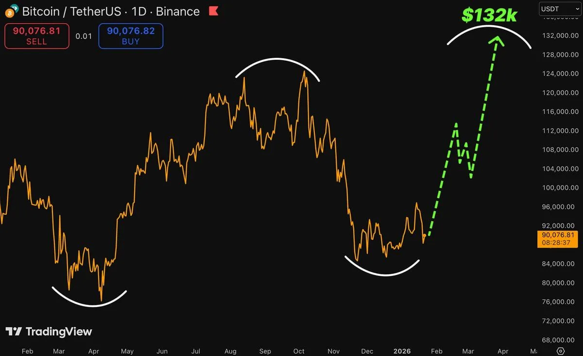 Bitcoin traded near $90,076 as a crypto commentator on X claimed the latest pullback has ended and projected a move to $132,000 within about 60 days, citing a TradingView daily chart of the BTC USDT pair.