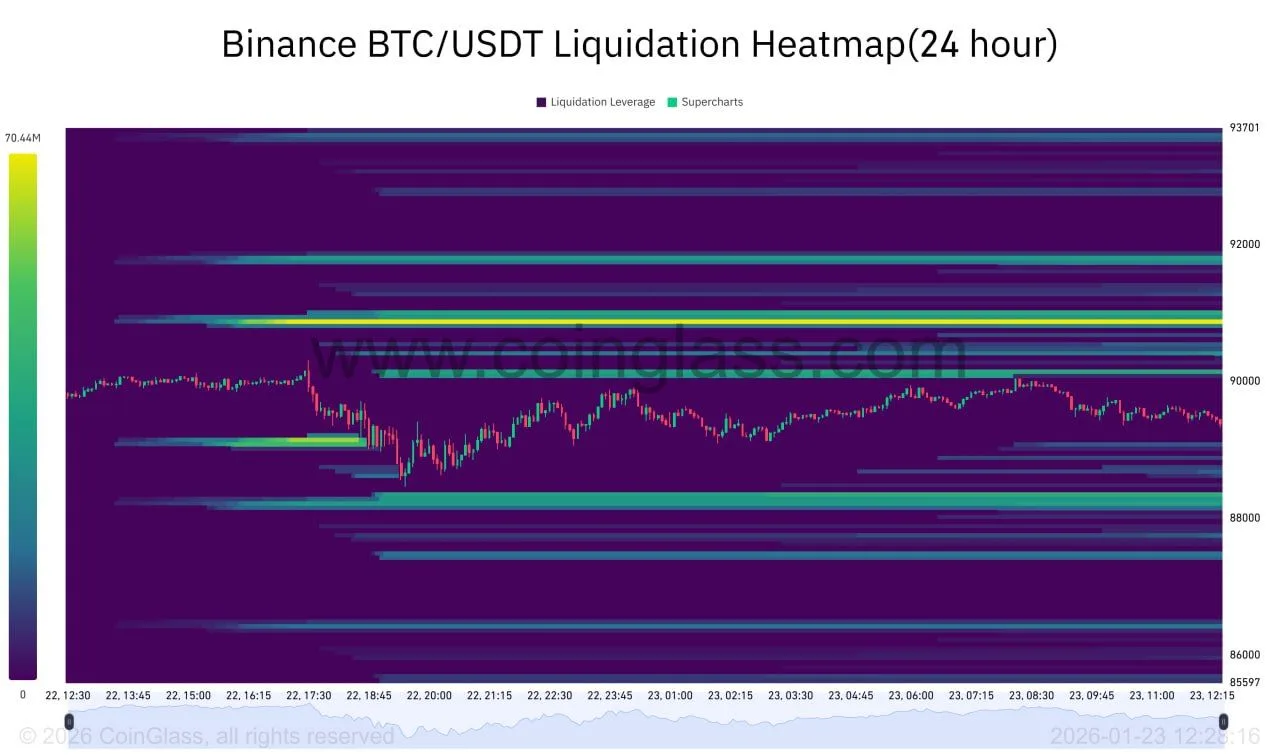 Liquidation heatmap highlights pressure near $92K and $88K