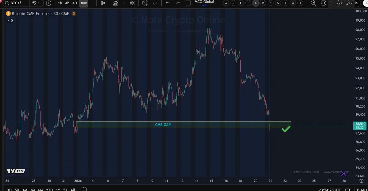 Bitcoin closed its lower CME futures gap on January 21, according to a 30 minute CME chart shared by More Crypto Online. Price sold off from the mid January peak near $98,000 and pushed into the highlighted gap zone around $88,000–$89,000, then stabilized.