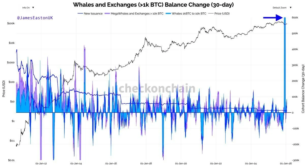 The chart tracks balance changes for wallets holding more than 1,000 BTC, including mega whales and exchange-linked addresses. Recent readings show a sharp positive spike on the right side of the chart, signaling net accumulation during the latest period.
