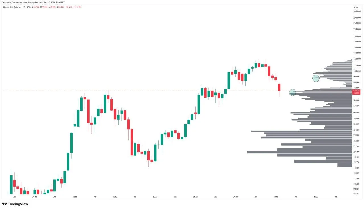 Bitcoin CME futures traded near $67,800 on the monthly chart as price slipped into a high-volume liquidity area highlighted by X user Cantonese Cat. The profile on the right side of the chart showed a dense band of historical trading activity in the $60,000 to $72,000 region. As a result, price moved into a zone where the market previously spent significant time building positions.
