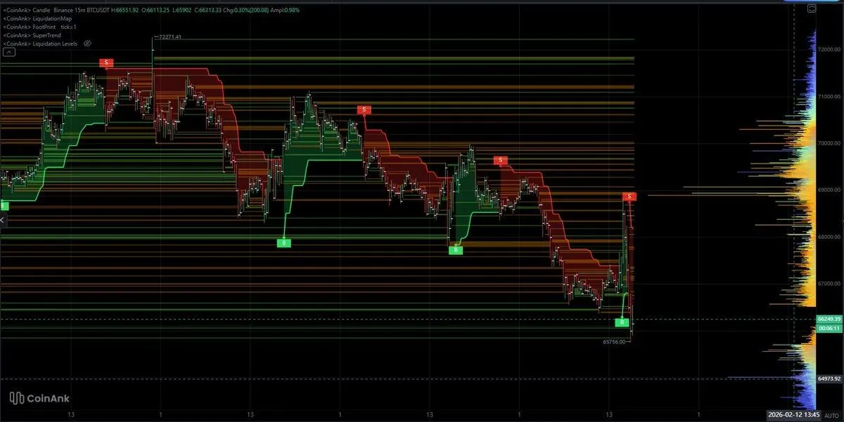 According to crypto analysts, IT Tech, the SuperTrend has flipped red, signaling bearish momentum for the BTC price. The analysts noted that failure to reclaim $68,000 quickly could expose BTC to more downside, with liquidation risk growing below $65,500.