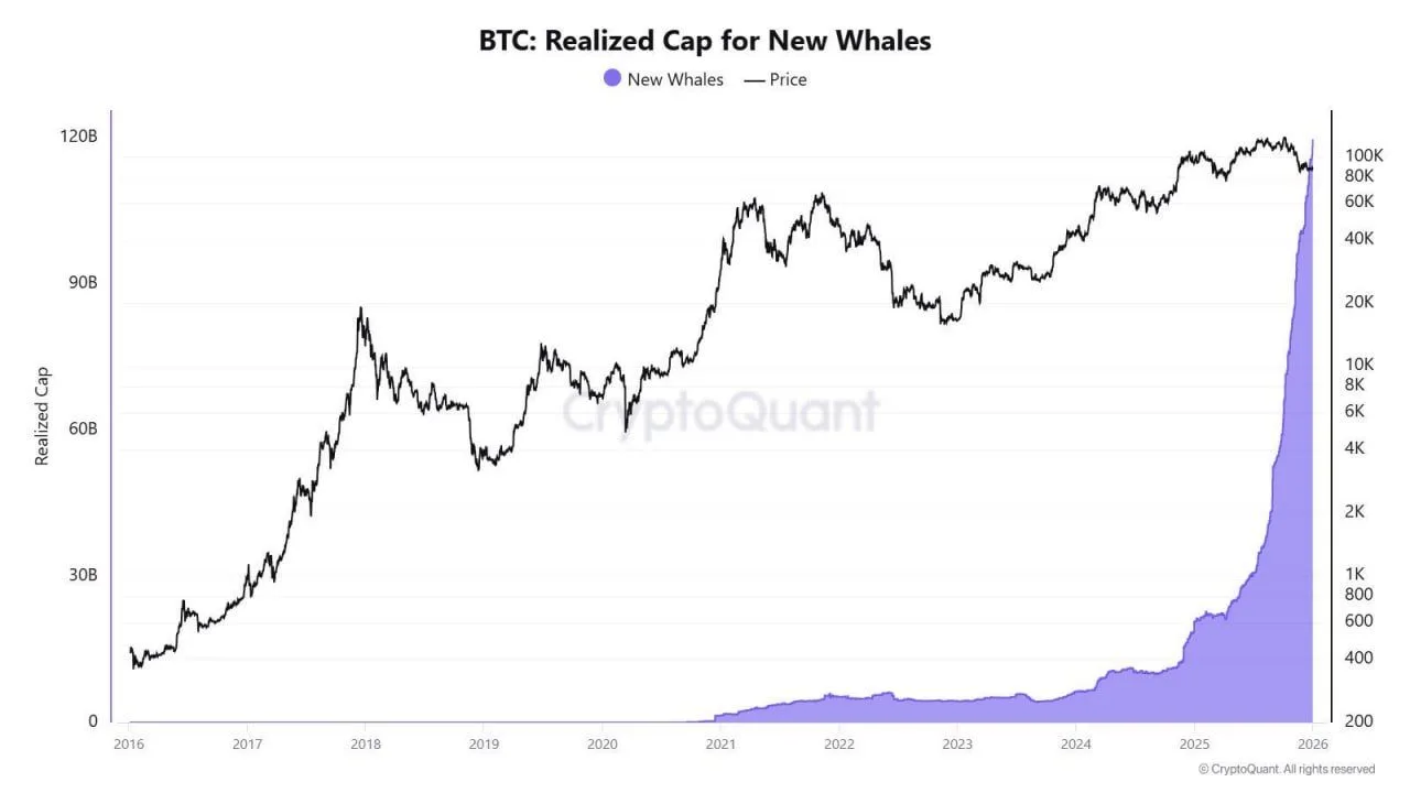 New Bitcoin whale wallets expanded their realized cap sharply at the end of the chart, rising toward about $120 billion as BTC price stayed near the top of its range. CryptoQuant’s “BTC: Realized Cap for New Whales” graphic shows the purple area barely visible until 2021, then growing slowly through 2022 and 2023 before turning higher in 2024.