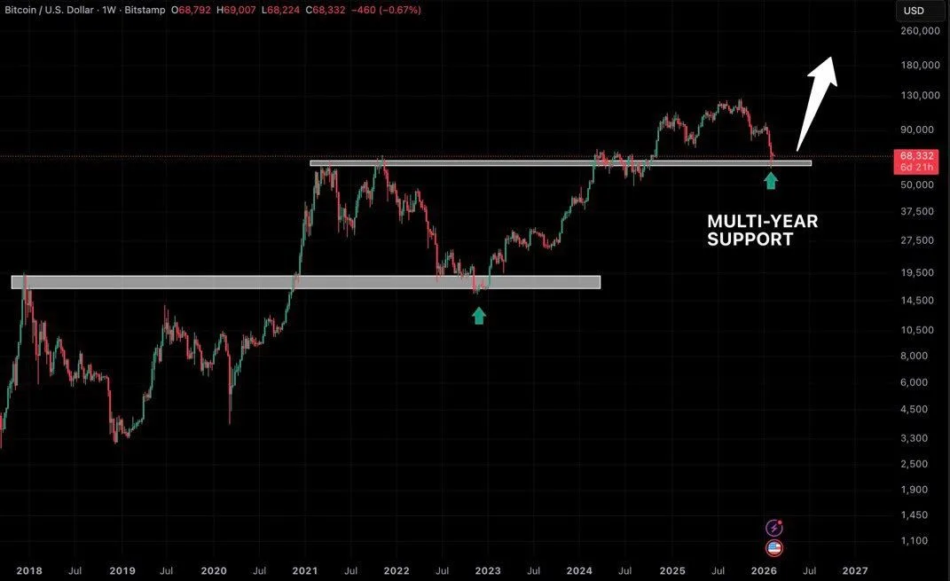 Bitcoin slid into a long running support zone on the weekly chart after a steep drop from its recent highs, and some traders framed the move as a potential turning point. The chart shows BTC near $68,332, with a horizontal band marked as “multi year support” sitting around the high $60,000 area.