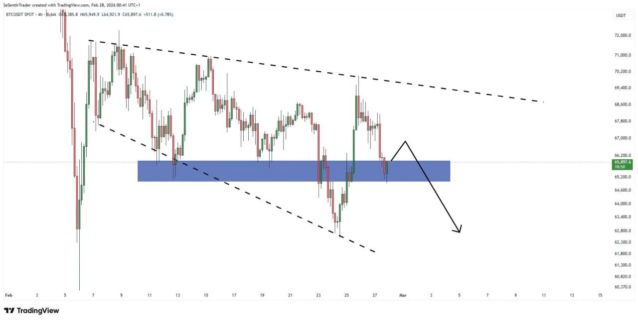 Two sentence intro: Bitcoin revisited a long term support zone on the weekly chart, reviving debate over whether the level marks a bottom or a breakdown risk. Meanwhile, a separate four hour setup around $65,000 left traders watching for either a bounce or another leg lower.