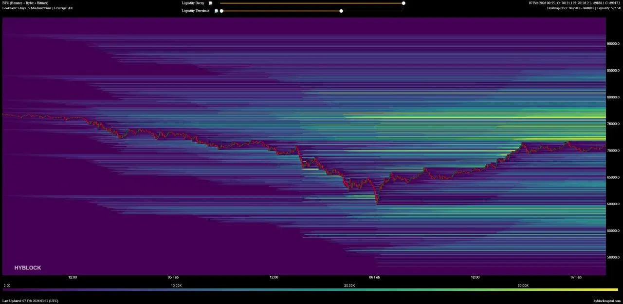 The chart shows Bitcoin sliding from the high $70,000s toward the low $60,000s before rebounding into the upper $60,000s and near $70,000. As price moved lower, horizontal liquidity bands accumulated overhead in the low to mid $70,000s, indicating a large volume of pending orders sitting above spot. At the same time, thinner liquidity layers formed below, near the low $60,000s, following the sharp drawdown and partial recovery.