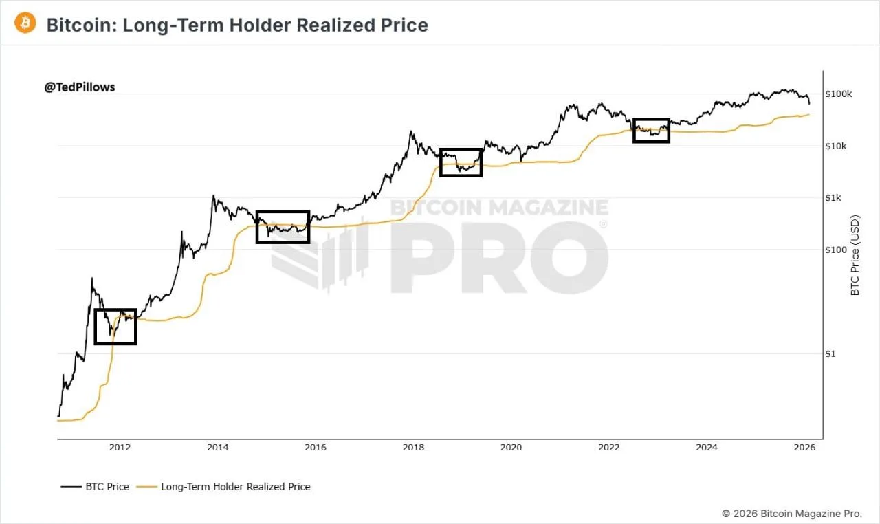 However, TedPillows added that he does not think Bitcoin will fall that far, even while pointing to the prior-cycle relationship highlighted by the boxed areas on the chart, where spot price briefly undercut the long term holder realized price before turning higher.