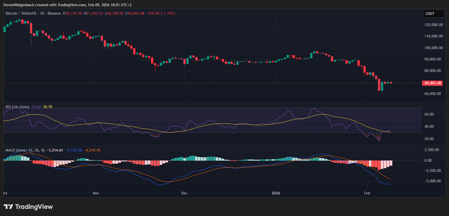 On the daily timeframe, Bitcoin appears to be attempting a slow recovery after a steep corrective phase.