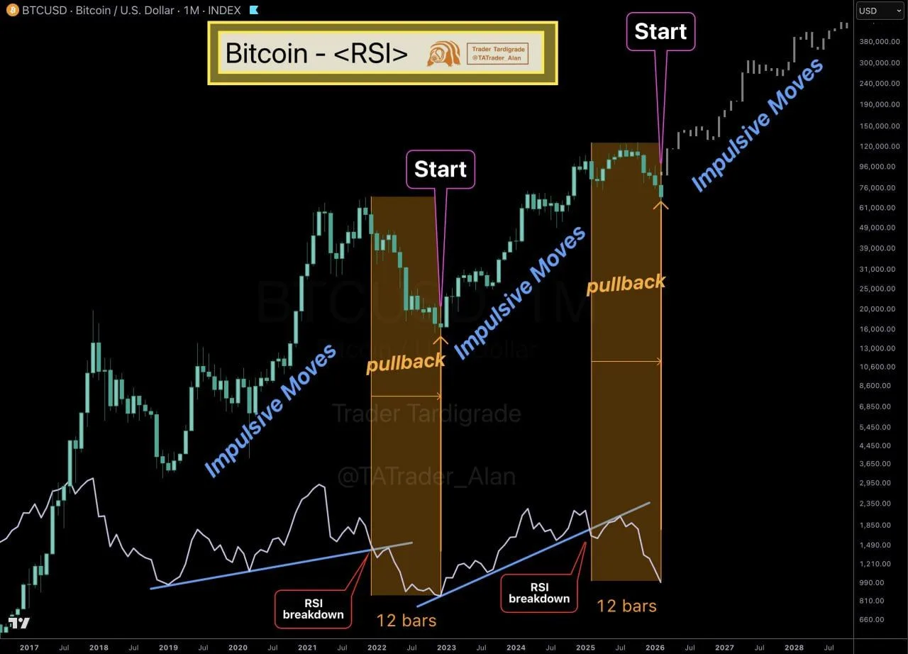In a chart shared with the claim, Bitcoin’s BTCUSD monthly price action appears inside a sequence the trader labels as “impulsive moves” followed by a “pullback.” The graphic highlights two prior “RSI breakdown” moments and marks each pullback as lasting “12 bars,” or about 12 months on the monthly timeframe.