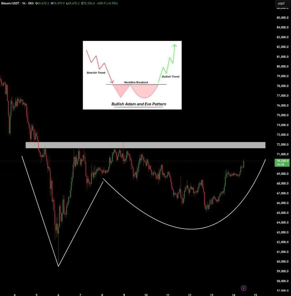 According to crypto analyst Trader Tardigrade, Bitcoin’s two-week chart still shows a repeated structure. According to him, a “Bear Flag followed by a recovery curve” appeared in the 2022–2023 cycle and the current 2025–2026 cycle. Consequently, with the BTC price recovering above $70k, the analysts note a rally above $80k could be near. Backing this forecast, the Bitcoin price is forming an “Adam and Eve” structure. According to analysts, a move above $72,000 could push the asset toward the $80,000 area.
