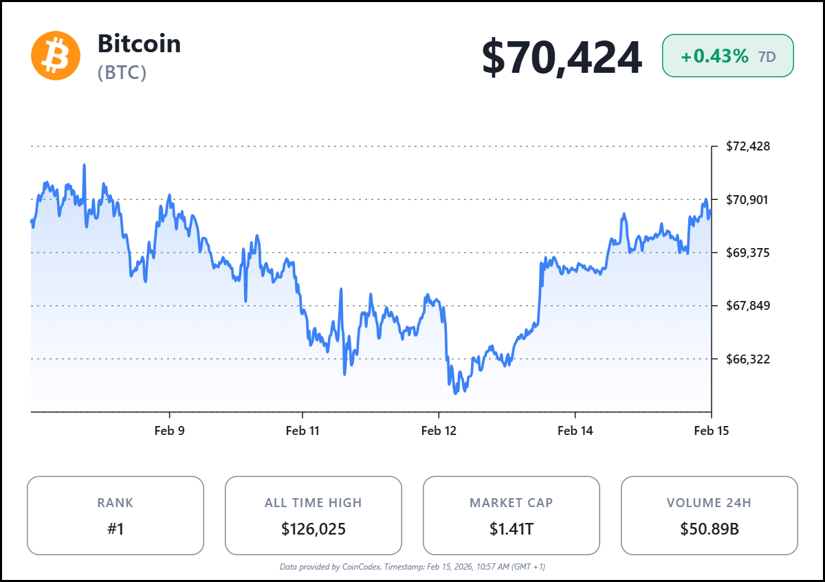 Bitcoin is trading around $70,500 on February 15, 2026, modestly higher over the past 24 hours after reclaiming the key 70k level following a deep early‑February slide toward 60k. The recovery has pushed Bitcoin’s market capitalization back above roughly $1.4 trillion, with daily spot and derivatives volume hovering near $43 billion as volatility stays elevated.