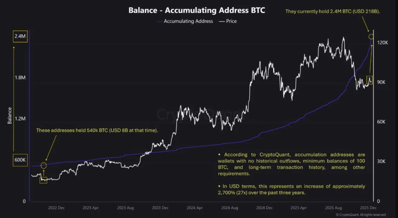 CryptoQuant data shows accumulation addresses hold about 2.4 million BTC, valued near $218 billion at current prices. During the 2022 bear market lows, the same cohort held about 540,000 BTC, worth roughly $8 billion at the time.