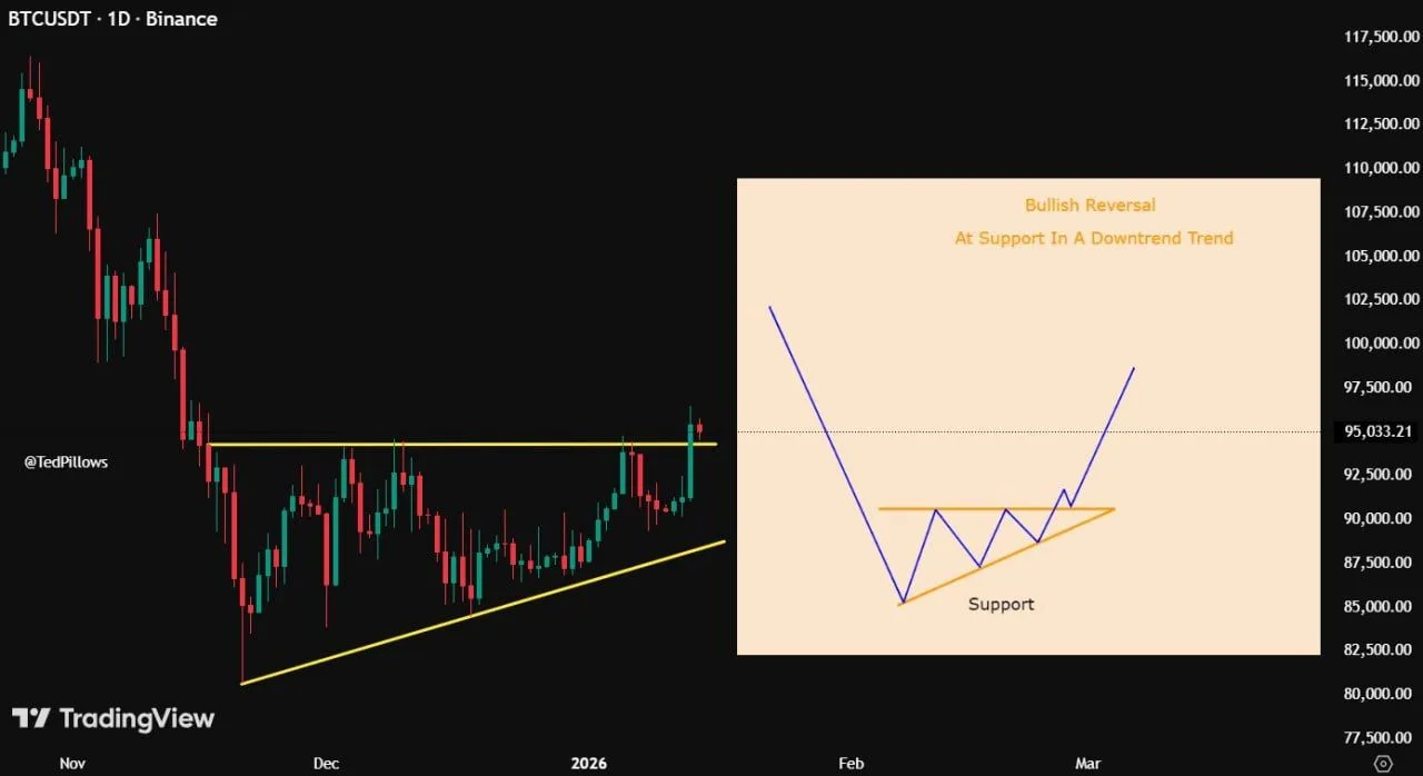 Ted Pillows wrote that Bitcoin needs to “hold the breakout trendline,” adding that $100,000 “could happen this month.” The chart also includes a schematic showing a bullish reversal pattern forming at support inside a broader downtrend structure, which frames the current rally as a rebound that still needs follow through to prove strength.