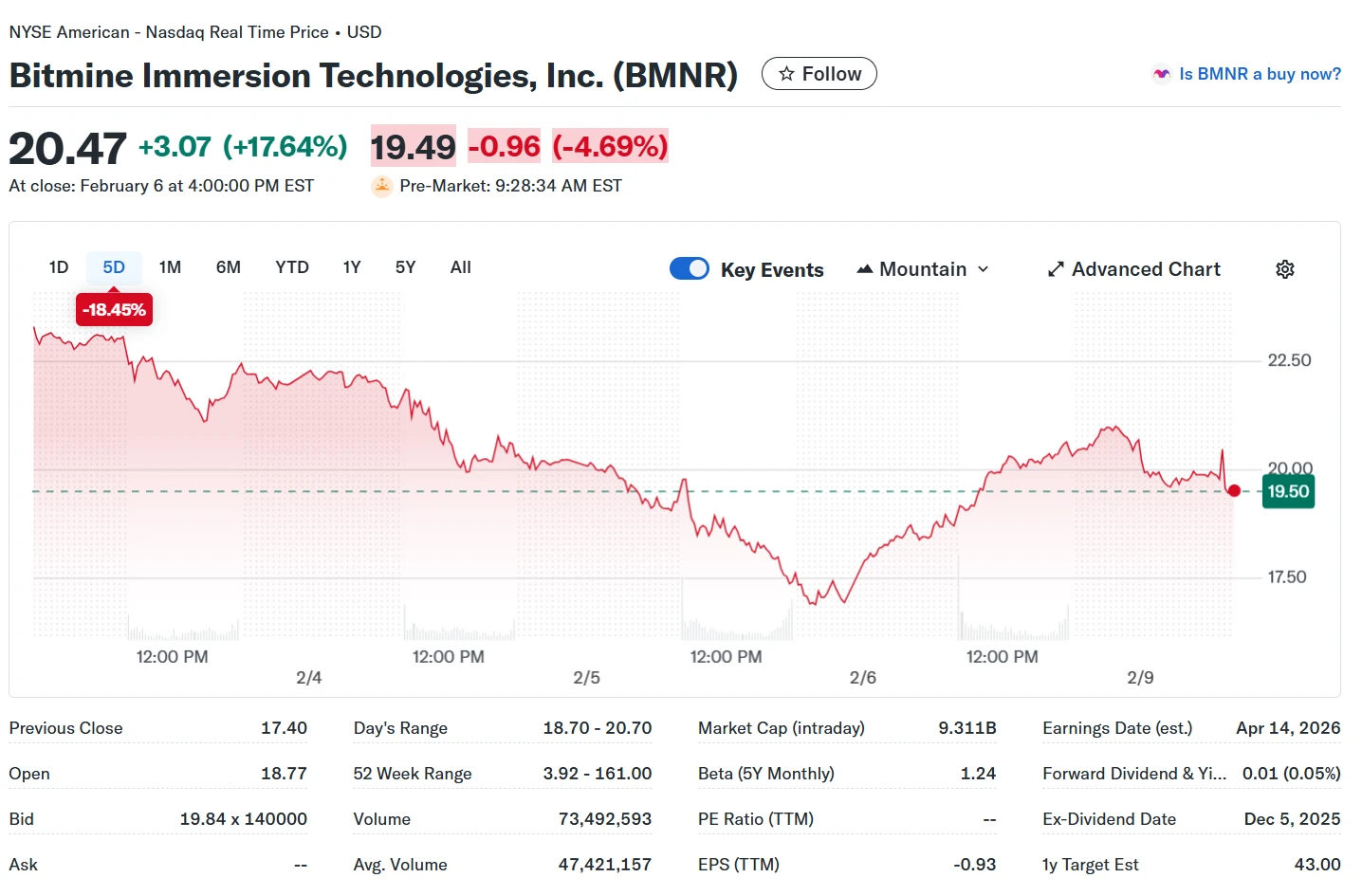 After yesterday’s volatile +17.6% riposte to $20.45 (session high $20.70, low $18.70 on explosive 73M volume vs. 46M average), premarket action sliced toward $18.64 lows, now desperately defending $17.40 February 5 territory. RSI indicators flash deeply oversold after BMNR’s insane 52-week journey ($3.92 bottom to $161 peak), with the 50-day moving average at $30.28 mocking current levels from above.