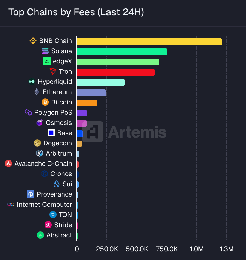 Data from the past 24 hours showed BNB Chain ranking among the top networks by transaction fees, a position often associated with Solana or Hyperliquid. Fees often reflect real usage rather than speculation alone. When users transact more frequently, fee totals rise alongside demand for block space.