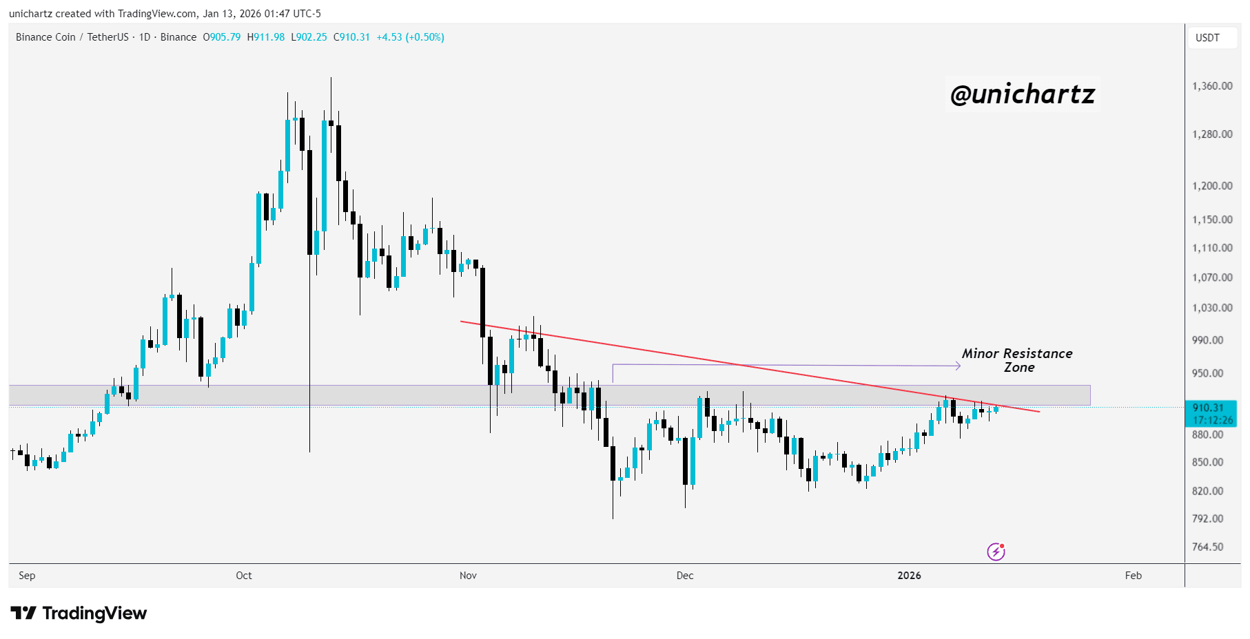 Market technicians have also focused on BNB’s price structure. Charts showed the token approaching a key resistance zone near $930, where a descending trendline converges with prior price levels. Traders often watch such areas for confirmation of momentum.