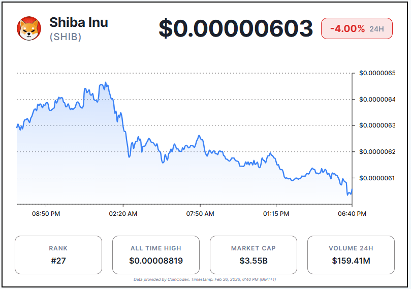 The timing matters. SHIB has fallen 11.43% since the start of 2026, and no clear catalyst has emerged within the Shiba Inu ecosystem to reverse that trend. At the time of writing, Shiba Inu trades at around $0.00000603, down 4% in the last 24 hours.