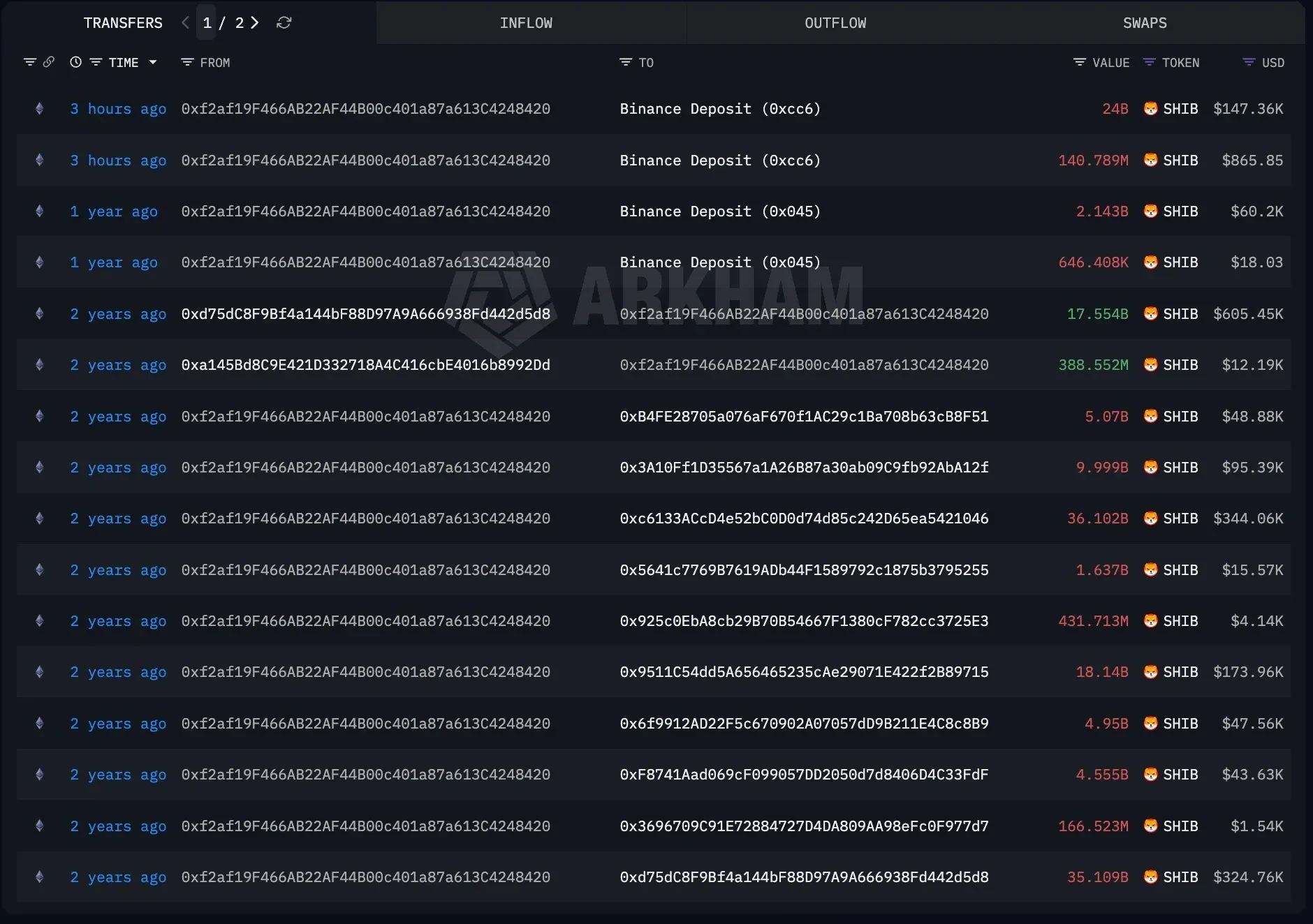 Those 2025 transactions sent slightly more than two billion SHIB to Binance. The wallet then went quiet again. Now it has returned with a transfer twelve times larger than the previous one, sent to the same destination.