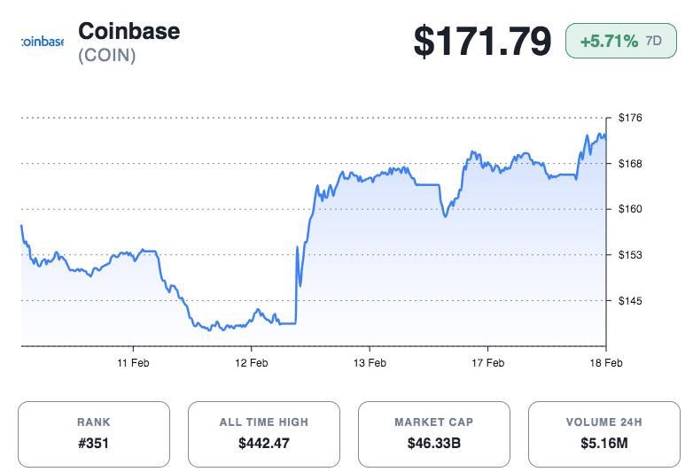 On February 18, Coinbase shares traded at $171.79, rising 3.22% on the day. The stock opened near $166 and quickly pushed higher. Intraday trading showed volatility between $166 and $173. However, buyers stepped in after early pullbacks, signaling renewed demand.