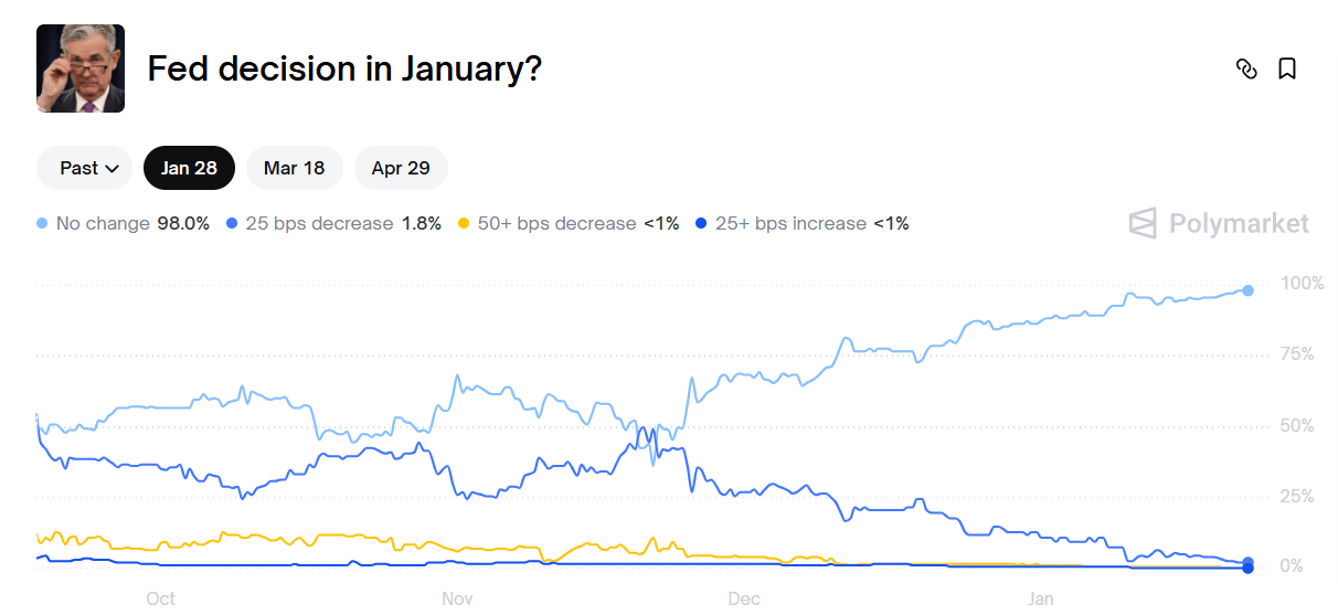 On the prediction market platform Polymarket, traders see a 98% chance that the Fed will leave rates unchanged.