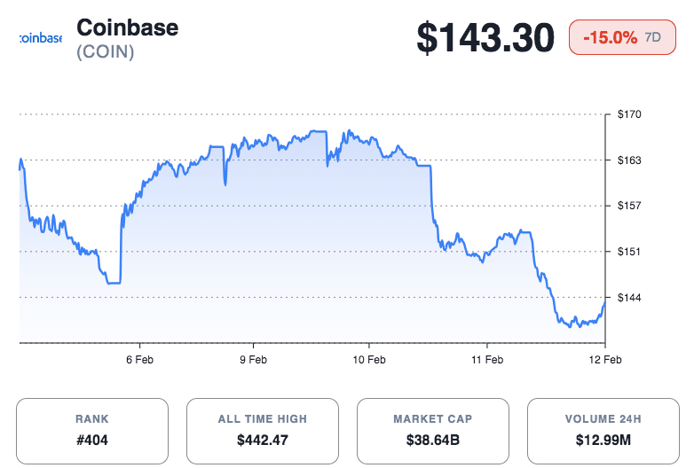 After holding above $160 for several sessions, the price fell quickly toward the mid-$140 range. Market data shows Coinbase holds a market capitalization of $38.64 billion. The stock’s all-time high stands at $442.47.
