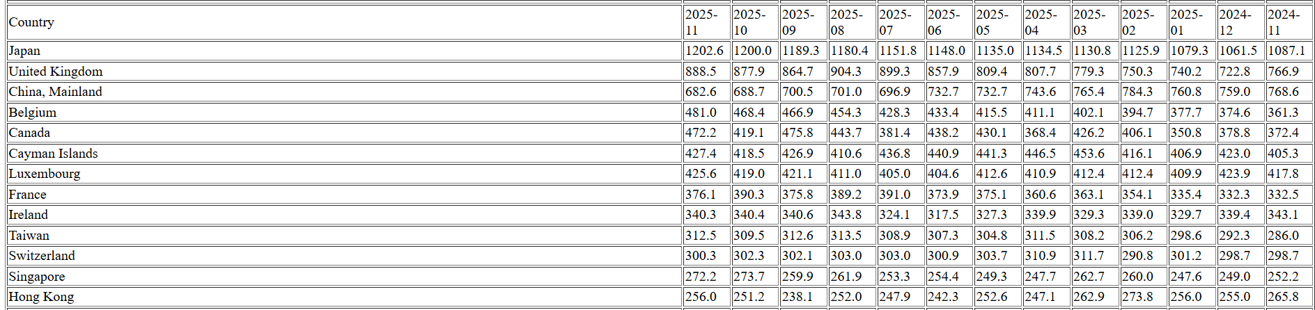 To contextualize the scale of the market AkademikerPension is stepping away from, the largest holders of U.S. Treasuries span both sovereign and institutional giants.