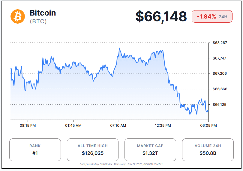 This matters because Bitcoin has shown recent signs of recovery. In the final week of February, BTC climbed from $62,700 to $67,700, accompanied by a return of dip-buying behavior among investors. At the time of writing, Bitcoin is trading at around $66,148, down 1.84% in the last 24 hours. Historically, when Bitcoin stabilizes and attracts renewed capital, DOGE has followed. If that pattern holds, BTC’s latest rebound could provide the momentum DOGE needs to reverse its extended downtrend.
