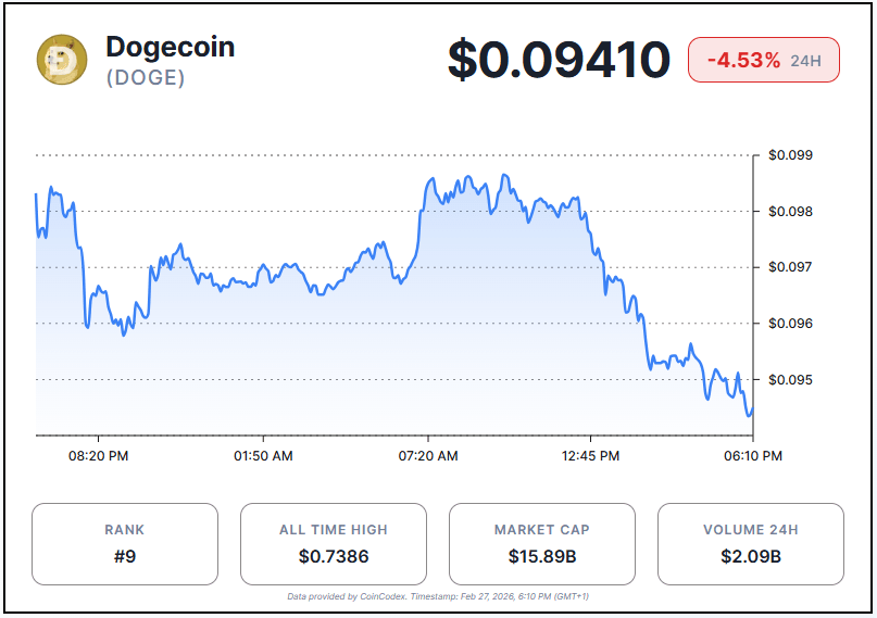 At the time of writing, Dogecoin trades at around $0.09410, down 4.53% in the last 24 hours.