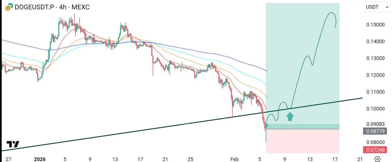 A TradingView snapshot of the MEXC market shows DOGE trading around the $0.088 to $0.091 area after a sharp drop. The chart also marks a downside level near $0.0725 and a nearby zone around $0.08, which sits below the current price.