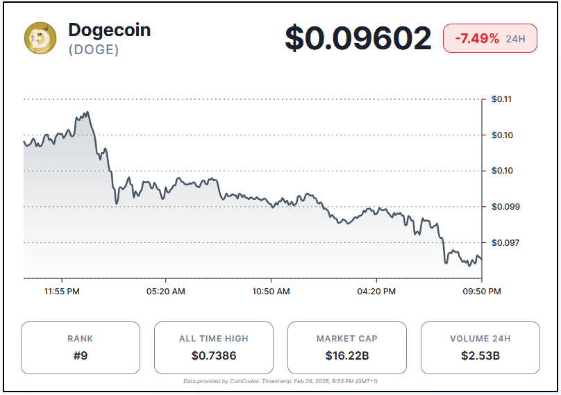 At the time of writing, DOGE traded at $0.09602, down 7.49% in the last 24 hours.