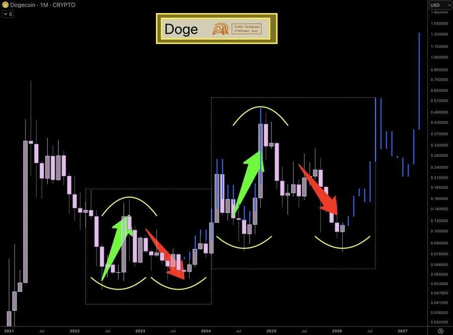 On the monthly timeframe, Dogecoin is trading between $0.12 and $0.14 as it confirms a second Double Bottom pattern. According to analyst Trader Tardigrade, the structure mirrors the previous setup that led to a strong breakout.