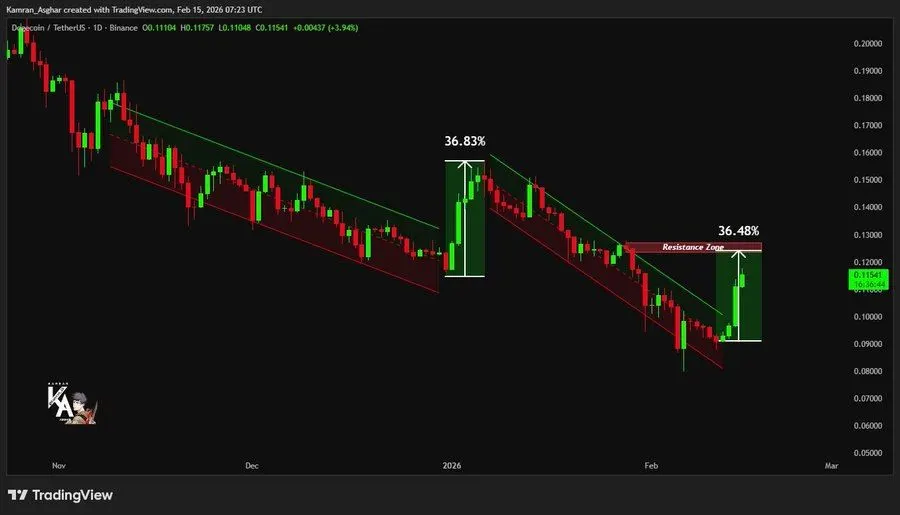 Dogecoin is once again mirroring its previous correction-to-breakout structure, according to analyst Kamran Asghar. On the chart, the earlier cycle showed a steady decline within a descending channel before a sharp 36.83% breakout rally. Price compressed near the lower boundary before surging aggressively, breaking above the descending resistance trendline and triggering strong upside momentum. That move marked a clear shift from correction to expansion, setting the tone for the next phase.