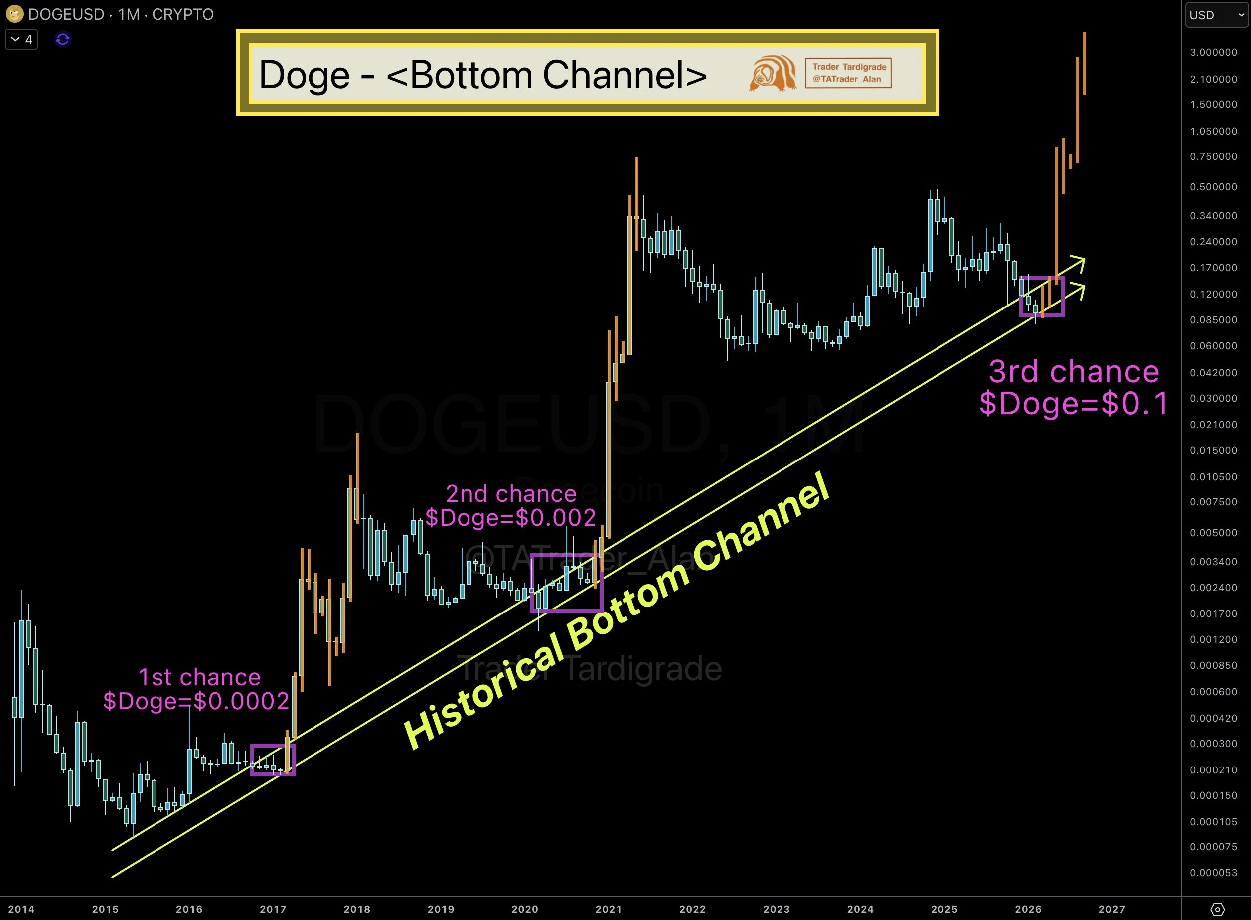 According to this analysis, DOGE is testing its third major support on this trendline. Previous tests in 2017 and 2021 preceded substantial rallies. The chart suggests the overall trend remains intact despite recent weakness.