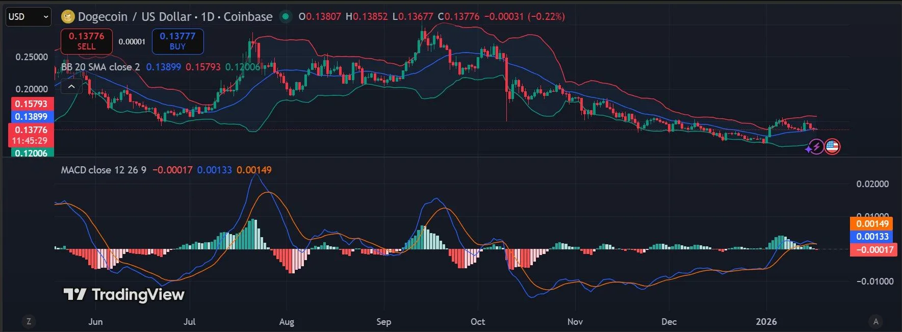 The Bollinger Bands show price trading near the lower band, with the lower band at $0.120 and the middle 20-day moving average around $0.139, highlighting continued downside pressure and weak volatility expansion. Price remains below the mid-band, which acts as dynamic resistance. On the momentum side, the MACD is close to the zero line, with the MACD line at 0.00133 and the signal line at 0.00149, resulting in a marginally negative histogram.