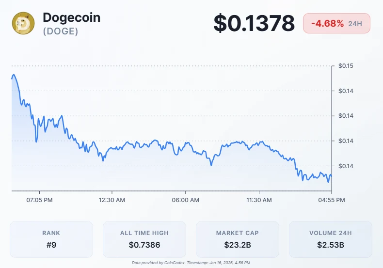 Dogecoin trades at $0.1378 at press time. The price reflects mixed performance across different timeframes. The cryptocurrency declined 4.68% over the past day and dropped 1.52% during the previous week. However, the monthly chart shows a 6.06% gain.