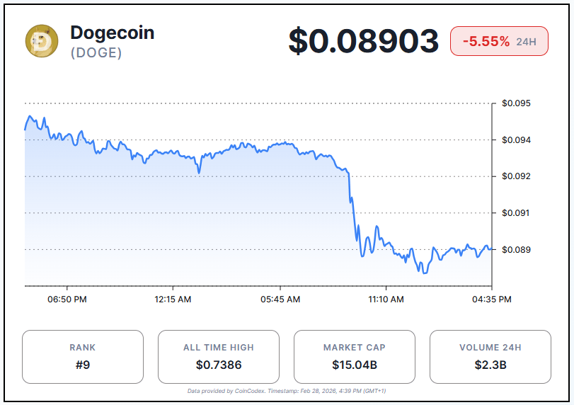 Dogecoin is struggling to hold ground. The memecoin has fallen to $0.08903, losing 5.5% as geopolitical tensions rattled broader crypto markets following Israel’s military strike on Iran. The price decline marks three consecutive sessions of lower lows, wiping out recent gains and confirming a sustained bearish structure.