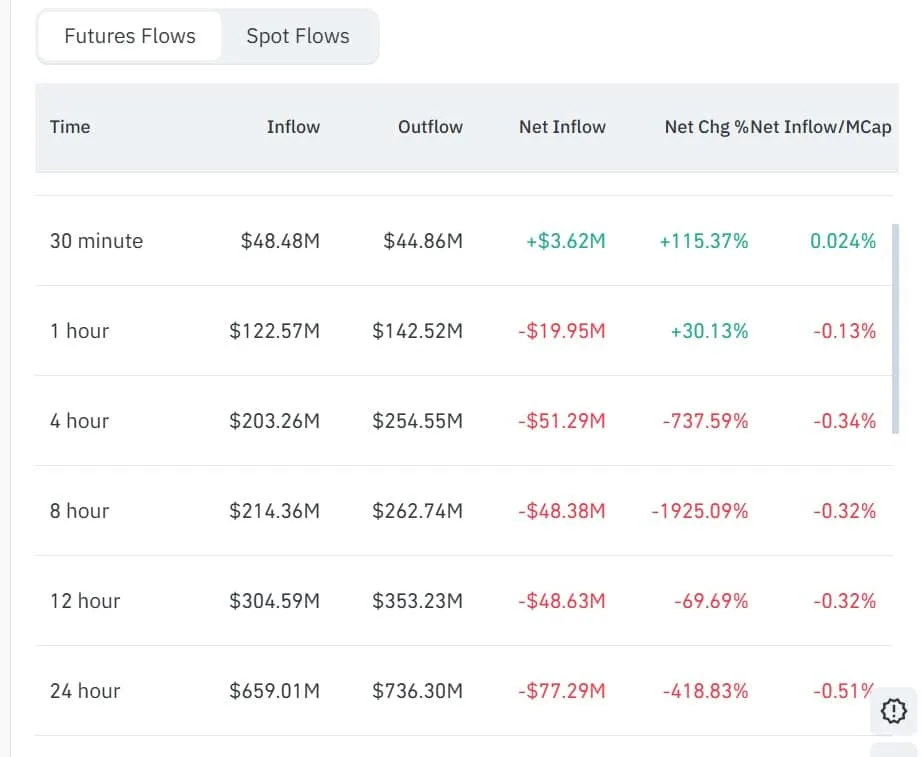 Selling pressure has not been limited to spot markets. Across futures, DOGE recorded $736 million in outflows against $659 million in inflows. That imbalance sent Futures Netflow plunging by 418%, to -$77.39 million. The scale of the outflow reflects a market where participants are actively reducing exposure rather than betting on a rebound.