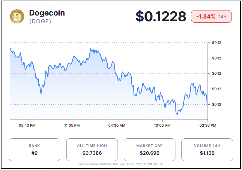 The digital asset continued to decline until Jan. 20, establishing a trading range between $0.12 and $0.129. Current prices show Dogecoin at $0.1228, down 1.34% over 24 hours and nearly 10.5% weekly.