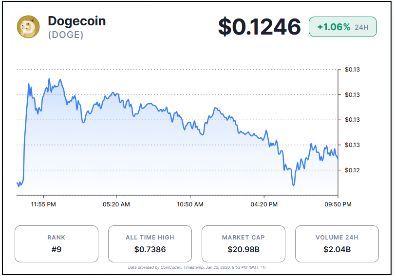 Dogecoin showed signs of stabilization on Thursday as broader markets rebounded. At the time of writing, Dogecoin trades at around $0.1246, suggesting a 1.06% increase in the last 24 hours.