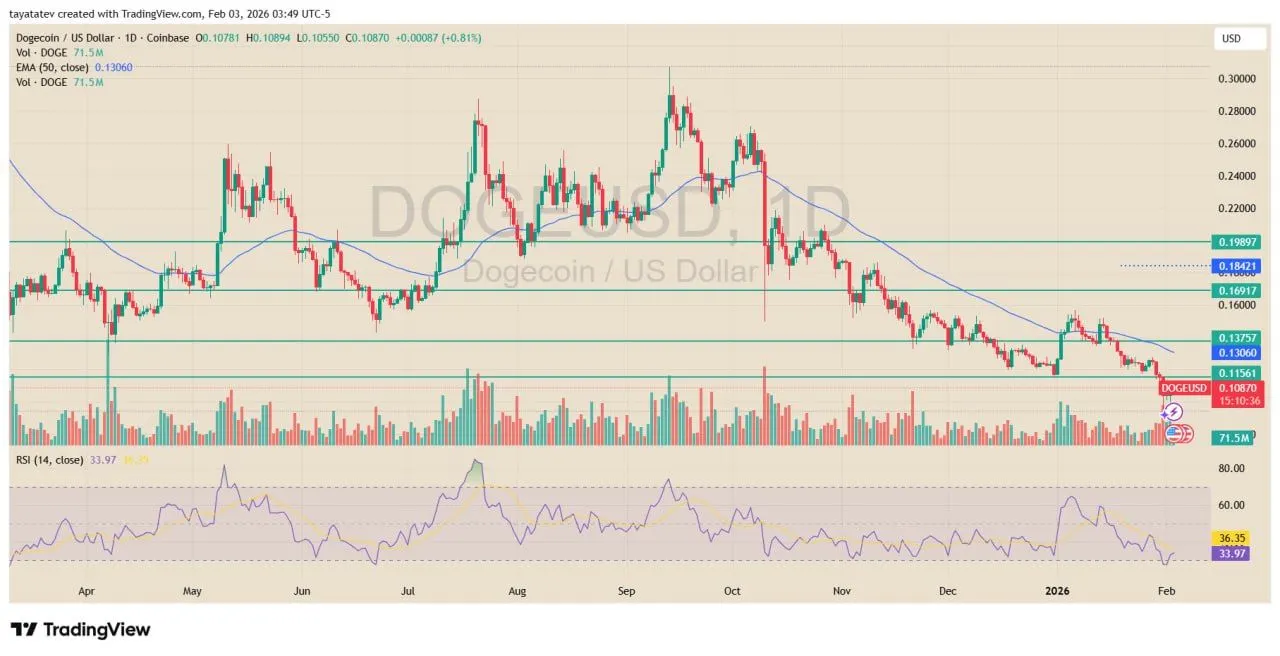Dogecoin traded near $0.108 on Feb. 3, extending losses after another failed recovery on the daily chart. The move kept DOGE firmly below the 50 day exponential moving average near $0.1306, which continues to slope lower and define the dominant trend.
