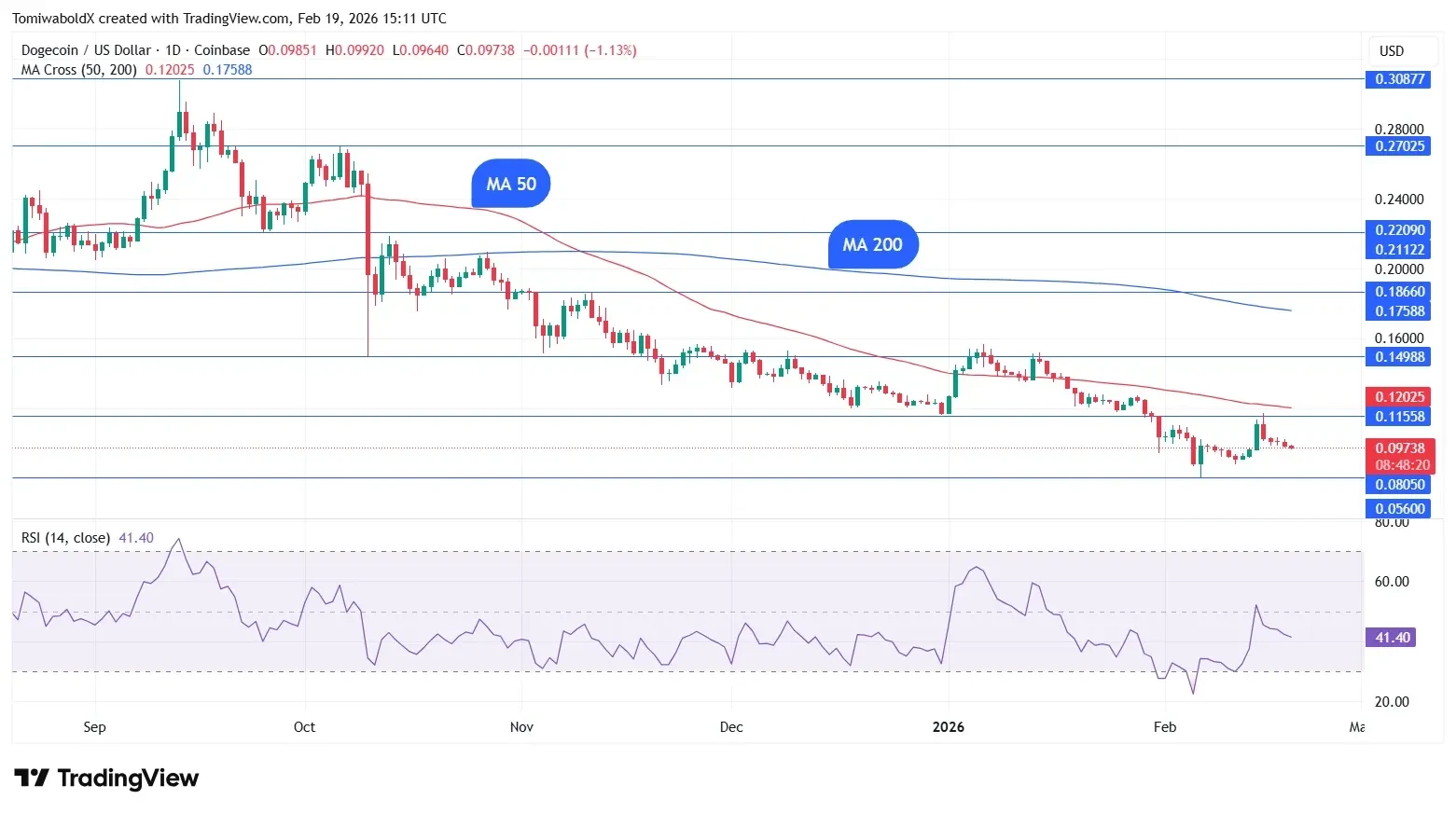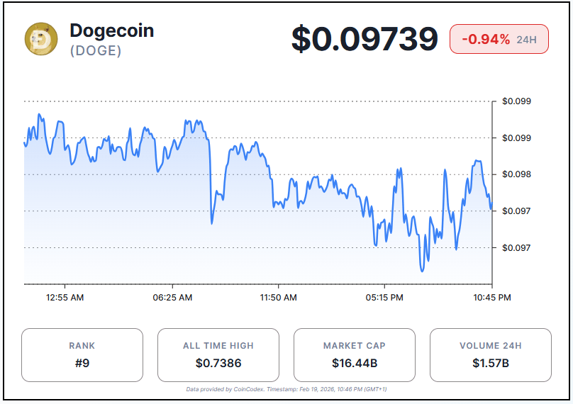 The Coinbase announcement arrived during a difficult stretch for Dogecoin. The token reached a high of $0.1175 on Sunday following a three-day rally. Profit-taking quickly followed. Multiple attempts to reclaim $0.10 between February 16 and 18 failed. Sellers maintained control throughout the week, and Dogecoin could not breach the $0.10 level during Thursday’s session.