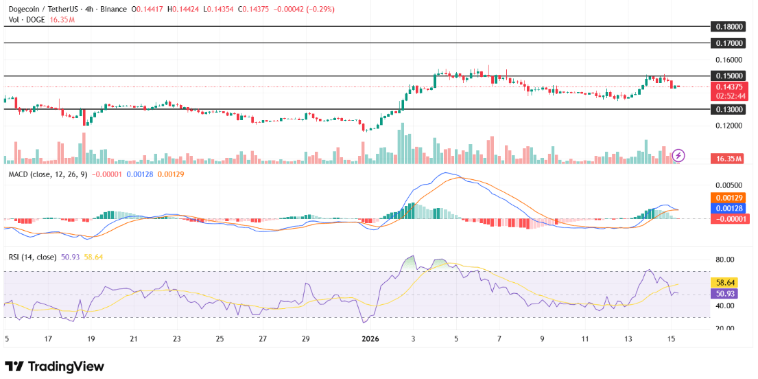 Dogecoin currently trades at $0.1440 following a rejection at the $0.15 resistance level. The meme cryptocurrency has entered a consolidation phase after failing to breach this psychological barrier.